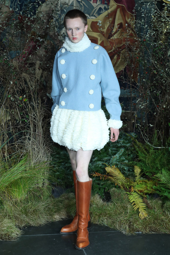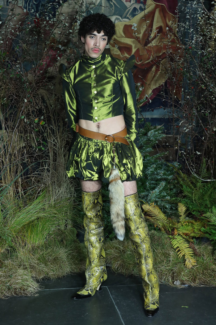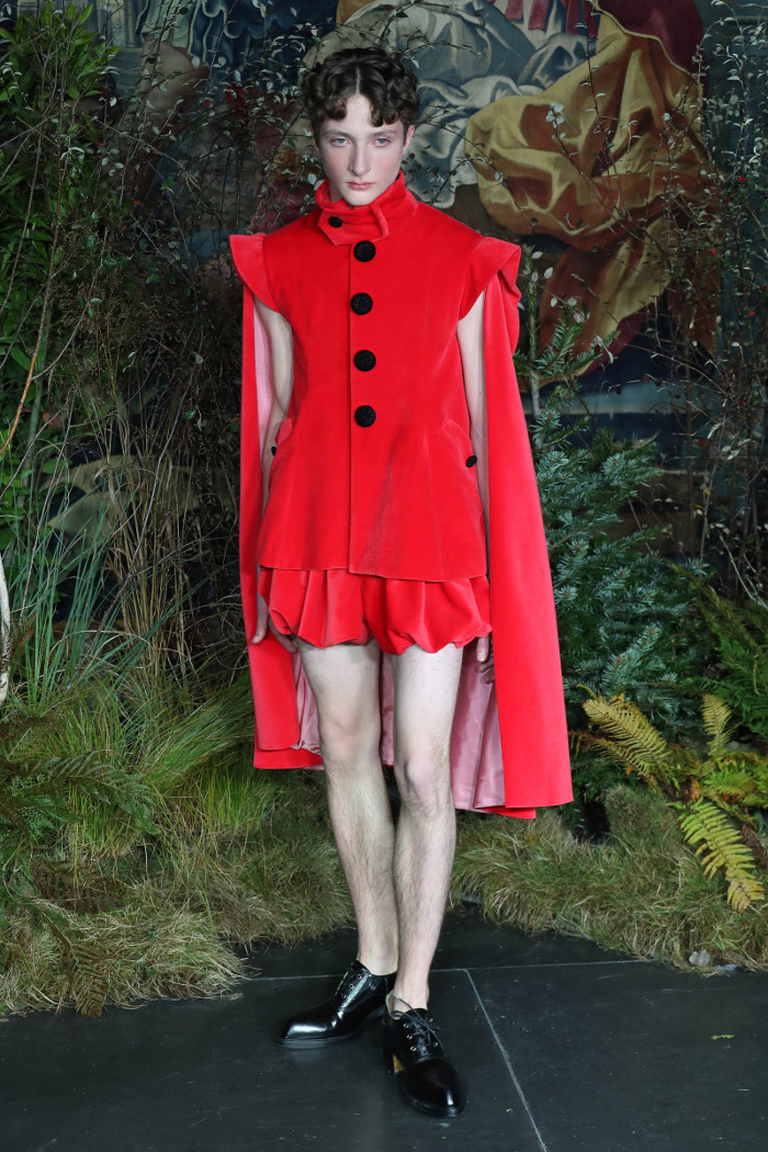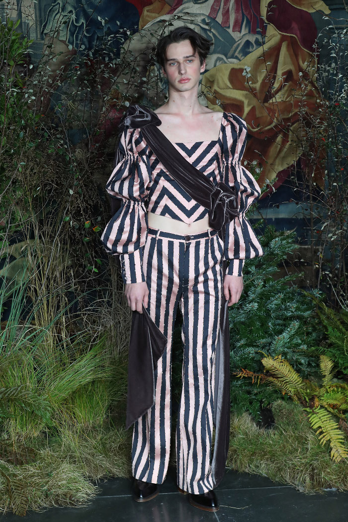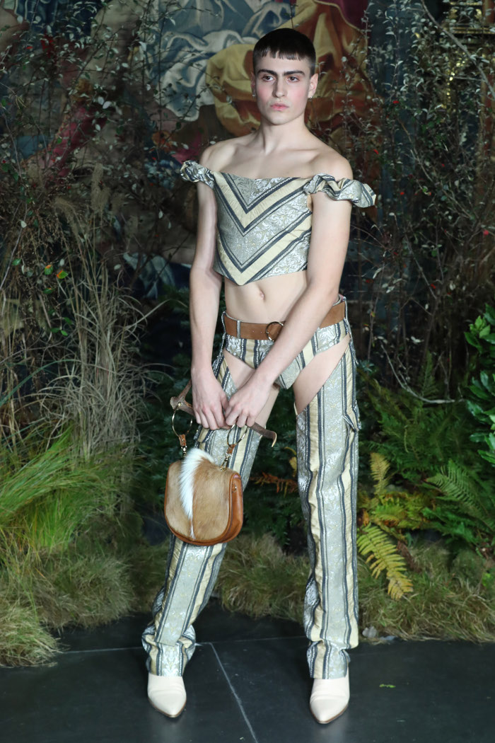 Ο σχεδιαστής από την Ανδαλουσία, που σπούδασε στο London College of Fashion, επέλεξε να ντύσει τα αρσενικά μοντέλα του με περίτεχνα φορέματα, αποκαλυπτικές φούστες και μεταξωτά τιράντες. Όλα αυτά συνδυασμένα με δερμάτινες μπότες over-the-knee, μαργαριτάρια και μεγάλες γυναικείες τσάντες.