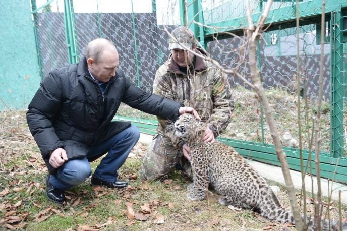 Εισήλθαν όλοι μαζί με παρουσία δημοσιογράφων στον ειδικό χώρο στέγασης για να δούν από κοντά μια λεοπάρδαλη 6 μηνών. Αυτή νευρίασε κάποια στιγμή και επιτέθηκε σε δυο δημοσιογράφους. Ο διευθυντής του Κέντρου, Umar Semyonov τους συνέστησε να φύγουν αλλά ο Πρόεδρος Πούτιν προτίμησε να παραμείνει. Προσέγγισε το ζώο και τελικά κατάφερε να το ηρεμήσει στην αγκαλιά του. ” Τα πάω καλά με τα ζώα, αισθάνονται τα πάντα…”