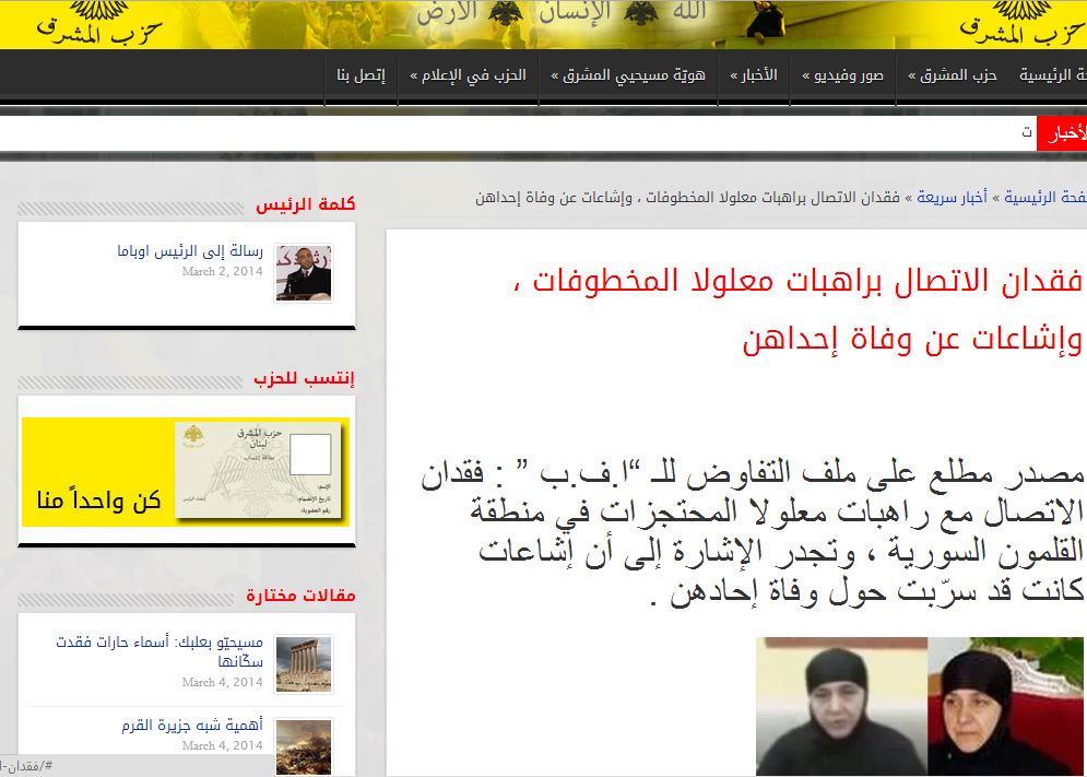 Στο site του το κόμμα Levant του Λιβάνου του Rodrigue Khoury αναφέρει ότι κυκλοφορούν φήμες για το θάνατο μιας μοναχής της Μονής της Αγίας Θέκλας που απήχθησαν αρχές Δεκεμβρίου από ισλαμιστές.