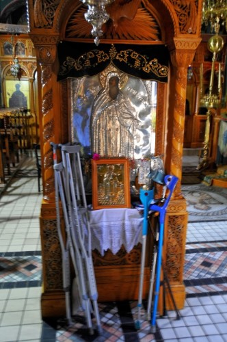 Δεν επρόκειτο για τα συνήθη χρυσά, αργυρά και άλλα κοσμήματα, που βάζουν στις εικόνες: Αλλά για πολλά ζευγάρια πατερίτσες και άλλα βοηθήματα ανθρώπων αρρώστων, αναπήρων!!!